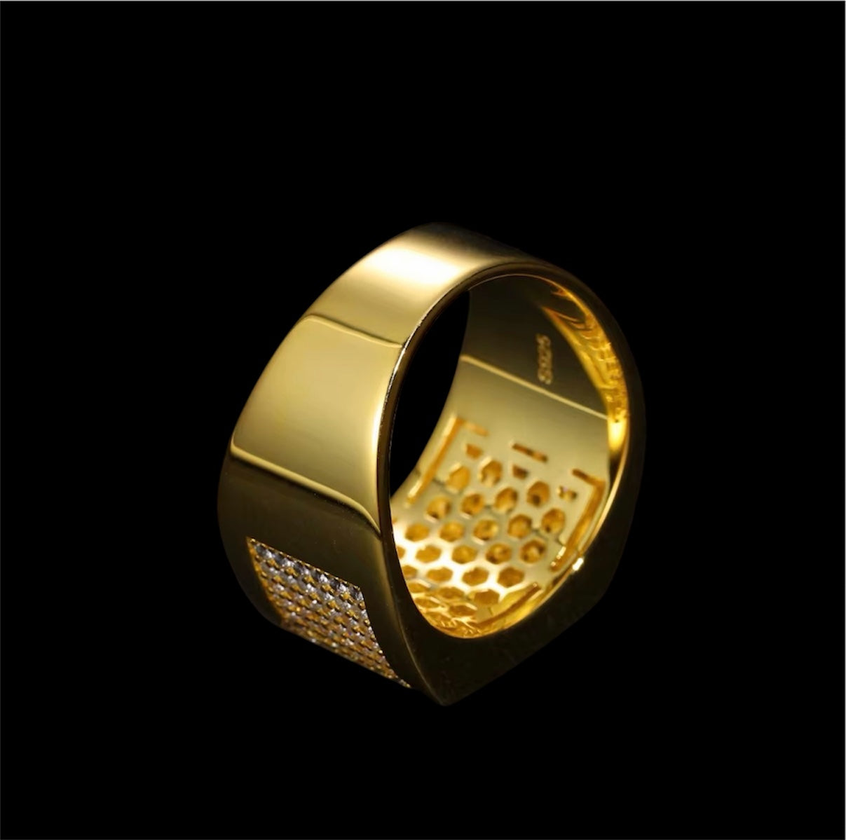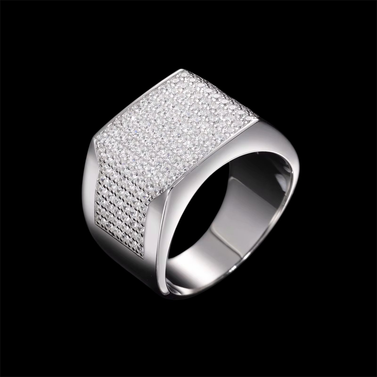Cette bague Half Iced combine un design carré moderne et une moitié sertie de moissanites VVS1 pour un éclat raffiné et audacieux.