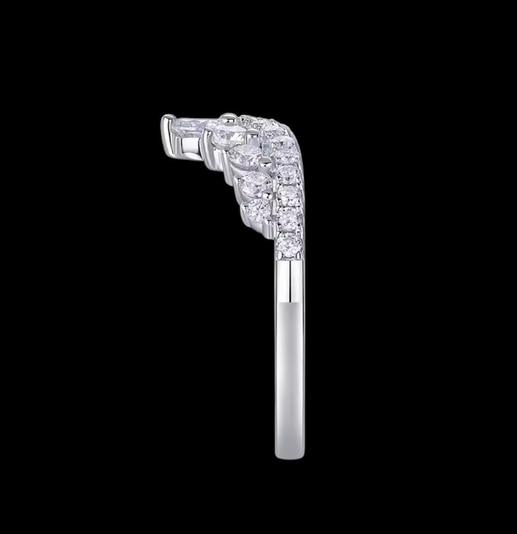 Sa monture délicatement sculptée évoque la silhouette d’une couronne, tandis que sa pierre centrale en moissanite VVS1dégage un éclat comparable au diamant.